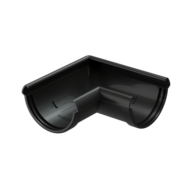Угловой элемент 90 гр. соединяет желоба при прямых углах поворота карниза. Перенаправляет поток воды. Такой элемент часто используется на вальмовых крышах или на специальных архитектурных выступах.